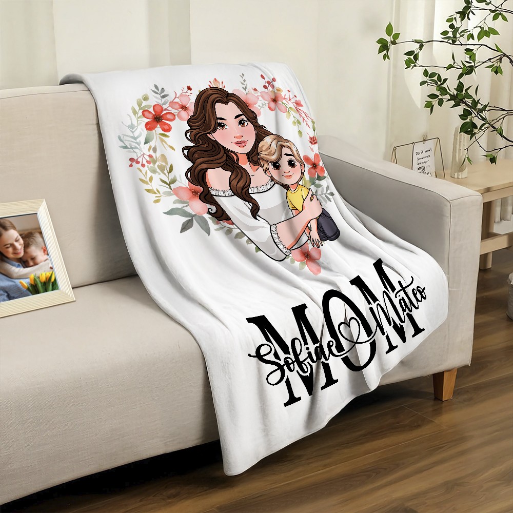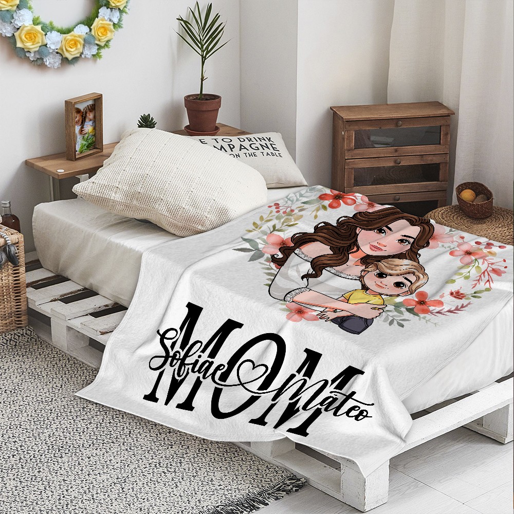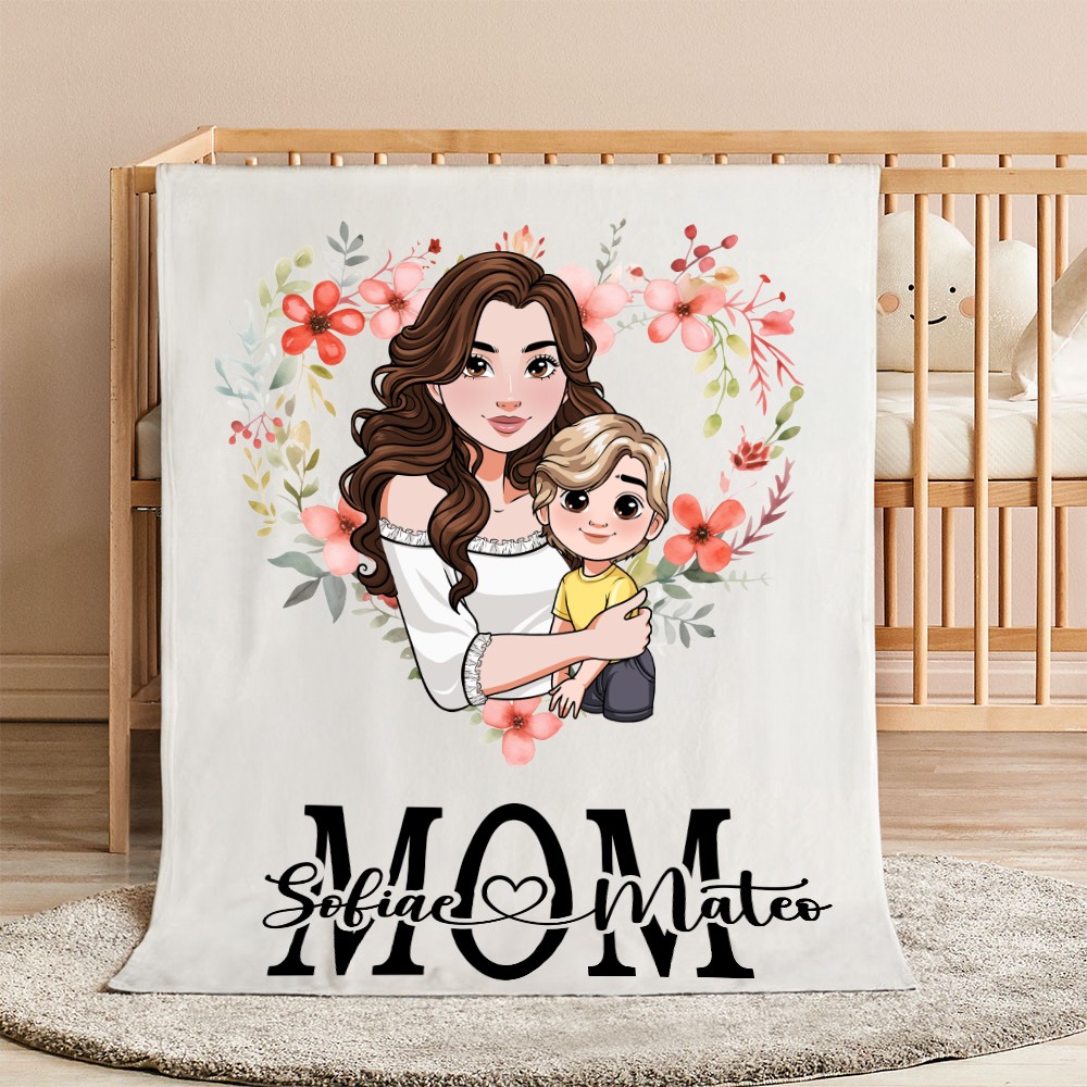 Personalized Touch - This blanket features a customized design with the names of both mom and child and a heart flower graphic, creating a heartfelt and unique keepsake that celebrates the special bond between mother and child.